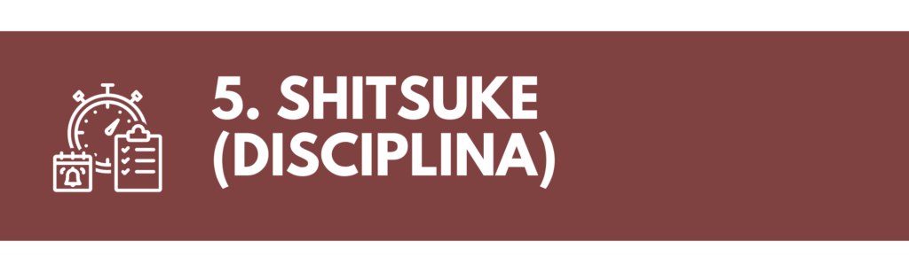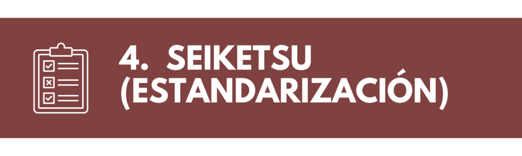 Al momento de llegar a este paso es importante asegurarse de estandarizar los procesos que ya se implementaron anteriormente, y tratar de mantener estos estándares establecidos lo mejor posible. De ser necesario se recomienda utilizar el cuadro del ciclo de trabajo 5s para señalar visualmente las actividades y frecuencia que deben monitorearse. Asimismo, también puede aplicarse una lista de 5 puntos clave para valorar la organización, orden y limpieza por área y por puesto, de esta manera pueden detectarse puntos de mejora y acciones preventivas para continuar con el proceso.